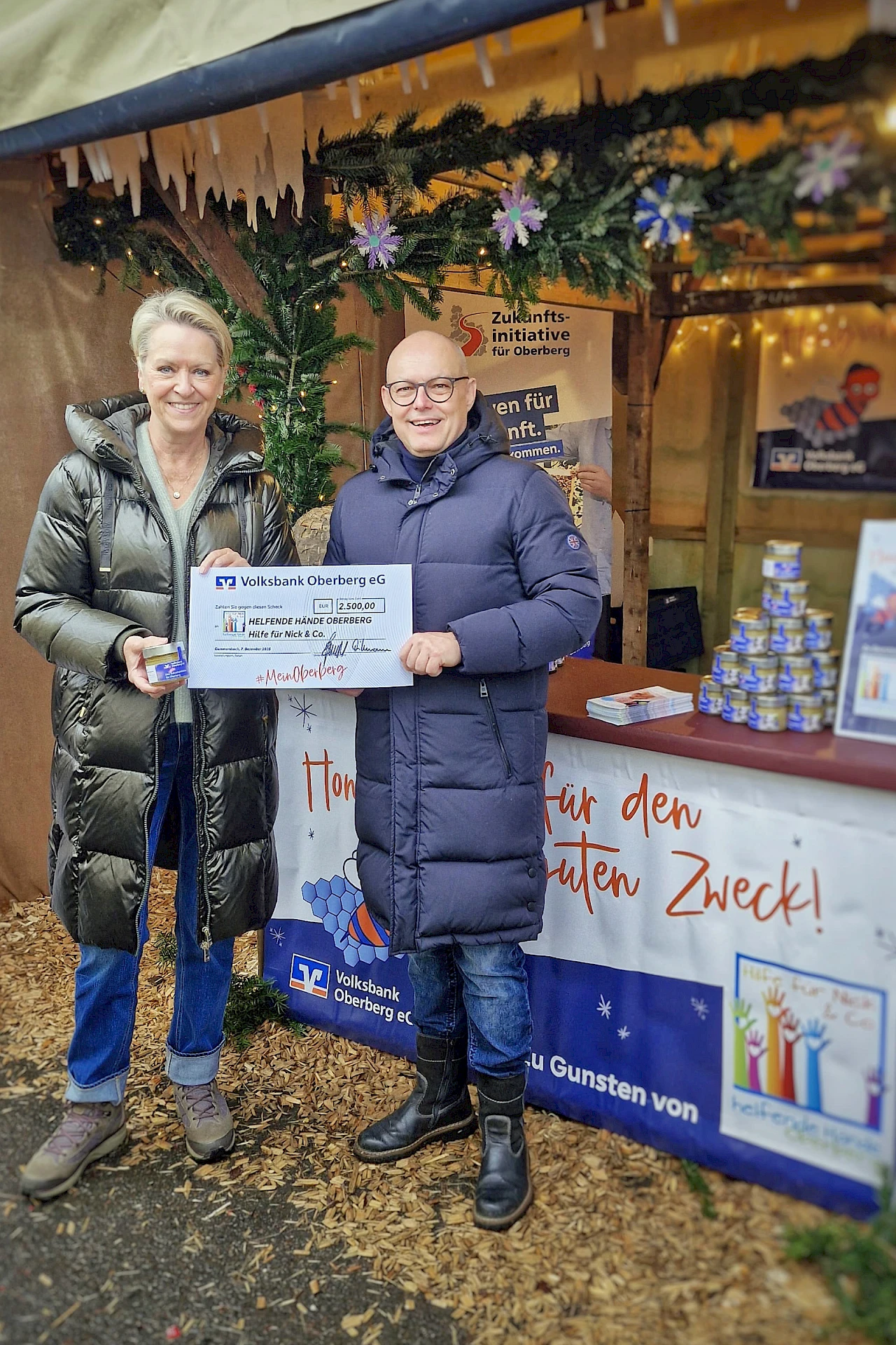 Im Winterdorf Gummersbach haben Mitarbeitende der Volksbank Oberberg den Honig der eigenen Bienen verkauft und so 2.500 Euro für die Initiative „Helfende Hände Oberberg Hilfe für Nick & Co“ gesammelt.
