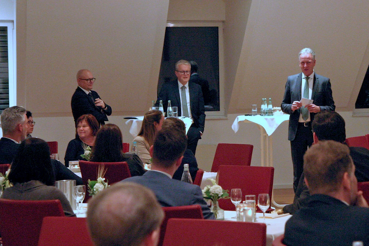Jedes Jahr lädt die Volksbank Oberberg ihre Jubilare zu einem festlichen Abendessen ein, um sich bei denjenigen zu bedanken, die auf eine beeindruckende Betriebszugehörigkeit von 10 (13 Mitarbeiter), 25 (9 Mitarbeiter) , 40 (8 Mitarbeiter) oder sogar 50 Jahren (1 Mitarbeiter) zurückblicken können. Aus diesem Anlass gaben der Vorstandsvorsitzende Ingo Stockhausen sowie seine Kollegen Frank Dabringhausen und Jörn Richling Einblicke in die aktuelle Situation der Bank und betonten die Bedeutung der Mitarbeiter für den Erfolg der Volksbank Oberberg.